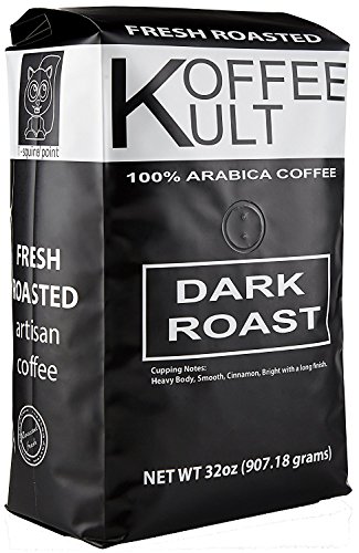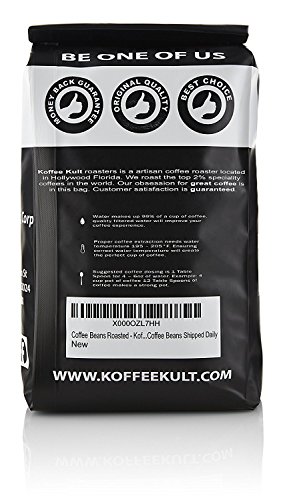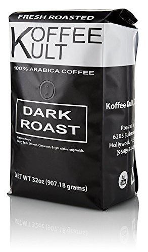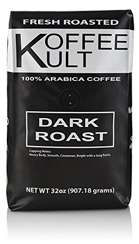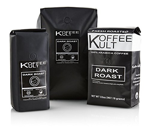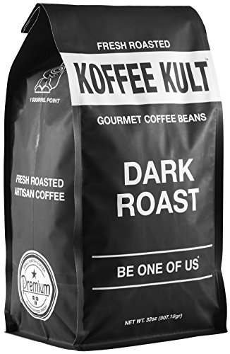 For coffee gourmet snobs that need a whole bean Dark Roast Coffee Beans. You will not be able to walk thru your kitchen without opening this coffee just to smell these freshly dark roasted coffee beans which are 100% arabica coffee. These are the same artisan roasted coffee beans that you will find in gourmet stores, espresso bars and cafés! The fresh roasted coffee beans will get you hooked on gourmet coffee.Koffee Kult Dark Roast coffee is artisan small batch roasted on one of our 15 or 60 kilo coffee roasters overseen by a roast master with 25 plus years of experience. Koffee Kult Dark Roast coffees roasting profile is developed to second crack in the roasting process and then released into the cooling bin for a fuller, more even flavor. This coffee is roasted in the USA to USA food standards. Then packaged as whole bean coffee to ensure optimal freshness in a resealable coffee bag with a one way value to enable the beans to degas while keeping air out.