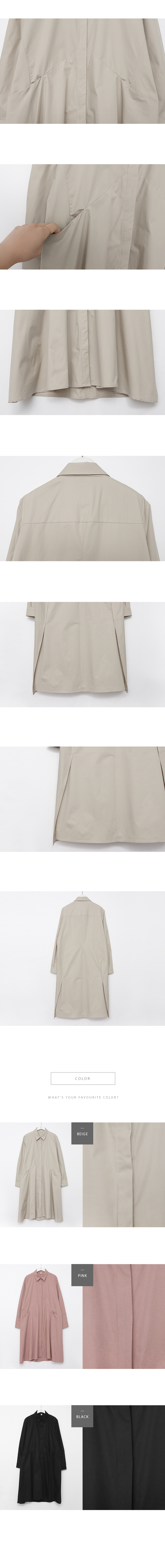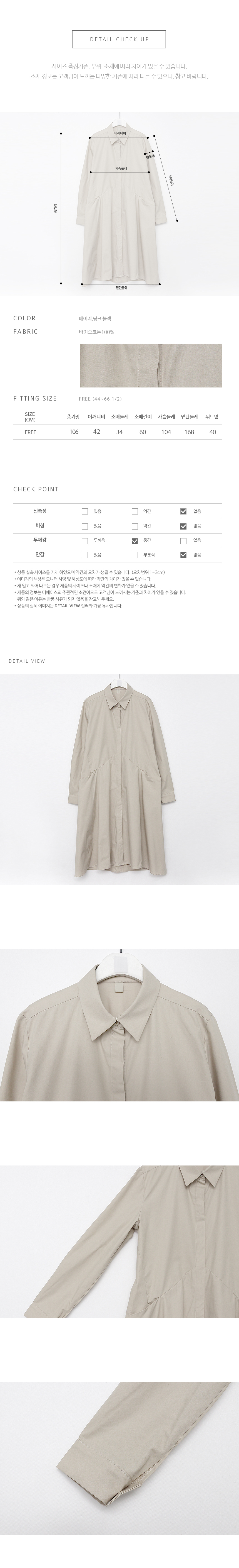 단정한 카라와 셔츠 스타일의 라인이 루즈하게 떨어지다 골반선에 사선의 포켓과 옆선의 절개를 주고 살짝 플레어 지며 A라인으로 마무리되는 스타일이에요!