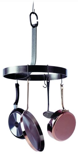 - Another excellent choice for small spaces, the "J" pot rack's hallmark is functionality and rustic simplicity - a single curved arm supports the 19-1/2-inch hoop