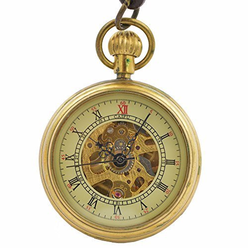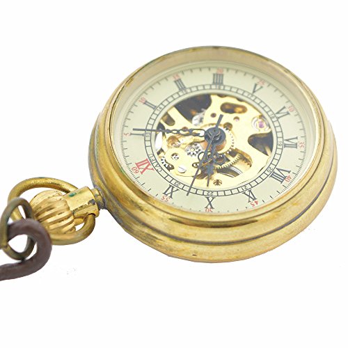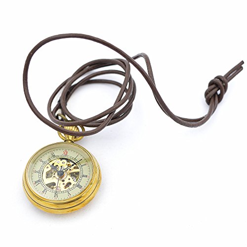 -. Title : Mini Copper Hollow Roman Number Hand Wind Mens Womens Mechanical Pocket Watch w/Necklace Leather Chain