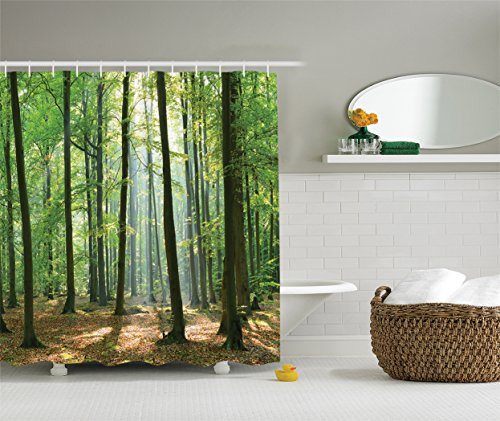 Ambesonne Farm House Decor Collection, Morning Sunbeams Hit Natural Alive Spring Forest from the Sky in a Sunny Day Picture, Polyester Fabric Bathroom Shower Curtain, Olive Green Khaki