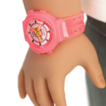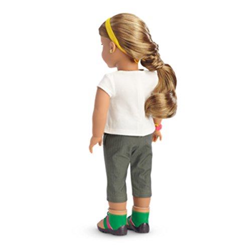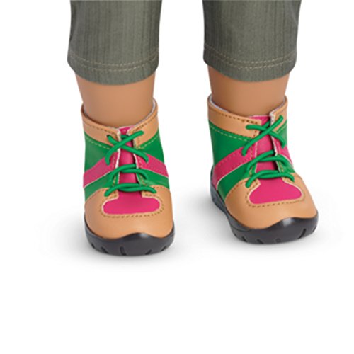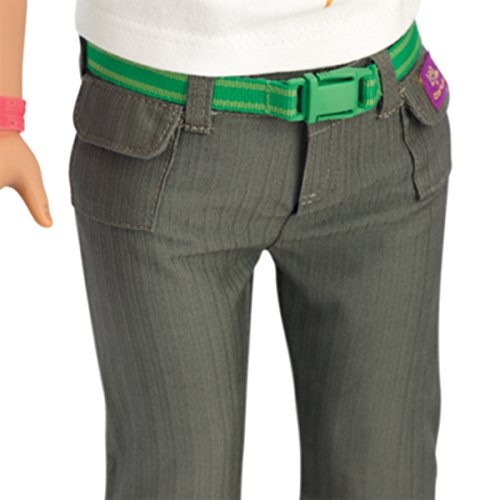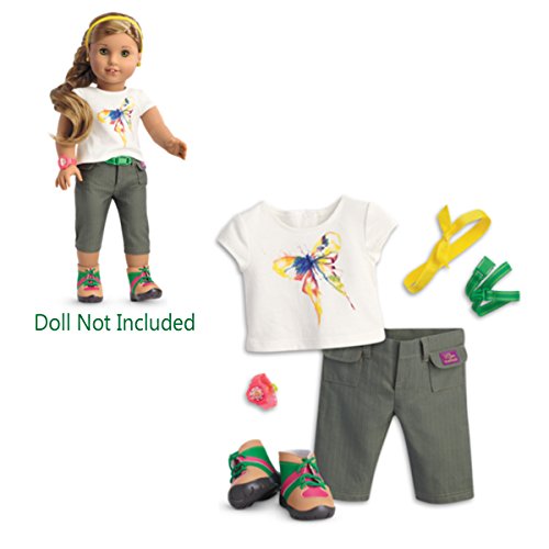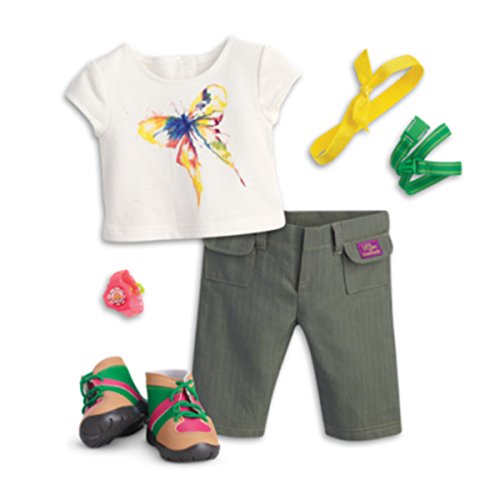 Outfit fits 18" Dolls Doll Not Included A tee with a watercolor butterfly design, cropped cargo-style pants A belt with a green buckle, headband Colorful hiking boots, sports watch