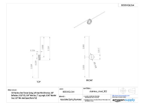302 Stainless Steel Torsion Spring, Left Hand Wind Direction, 180° Deflection, 0.518" OD, 0.04" Wire Size, 2" Leg Length, 0.343" Mandrel Size, 0.26" Min. Axial Space (Pack of 10)