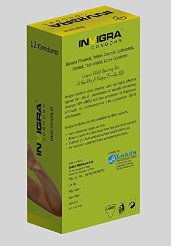 Studio : Leads Pharma Private Limited Publisher : Leads Pharma Private Limited Binding : Health and Beauty Product Description 12 Banana flavored, Yellow colored, lubricated, teat-ended, latex condoms. Invigra condoms when properly used are highly effective against the risk of transmission of sexually transmitted diseases, HIV(AIDS) and also prevention of pregnancy, although no contraceptives can guarantee 100% effectiveness. Invigra Condoms are also available in other variants. ? Each condom for single use only ? Store in a cool, dry place away from heat and direct sunlight ? If allergic to rubber products consult doctor before use ? For maximum protection follow enclosed instructions 0