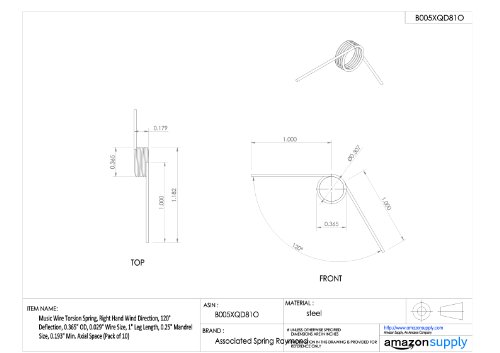 Music Wire Torsion Spring, Right Hand Wind Direction, 120° Deflection, 0.365" OD, 0.029" Wire Size, 1" Leg Length, 0.25" Mandrel Size, 0.193" Min. Axial Space (Pack of 10)