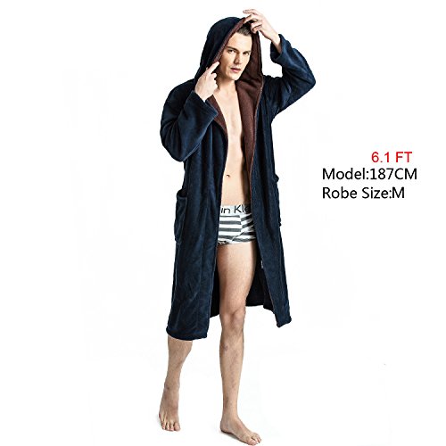 Hooded Herringbone Men's Navy Blue Soft Spa Bathrobe with Brown Kimono Shawl Collar(L)