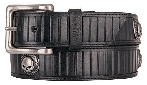 Studio : Lodis Publisher : Lodis Binding : Apparel Product Description Harley-Davidson® Men's Road Bump Genuine Leather Belt, HDMBT11252-BLK. This belt is tough and ready for the ride. Not an inch of faux leather on this belt, constructed from high-quality Genuine cowhide leather with an embossed striped texture. Features engraved Willie G Skull medallions around belt. Complete with antique nickle finish buckle. Embossed Harley-Davidson® script on belt loop. Excellent quality leather belt, made for those bikers who want the best of everything! Standard width: 1.5". HDMBT11252-BLK 0
