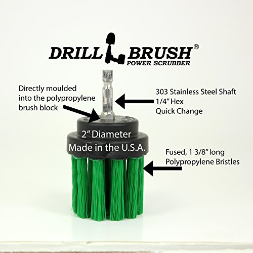 -. Binding : Home -. Brand : Drillbrush -. Color : Green -. EAN : 0700425599027 -. Feature : Save time and effort cleaning and scrubbing around the house, garage, and your car or boat / Durable long nylon bristles / Features a stainless steel quarter inch shaft that works with all cordless drills and impact drivers / Smaller diameter allows access to tight and hard to reach areas such as around bathroom fixtures and corners / Made in the U.S.A. -. IsAutographed : 0 -. Label : Drillbrush -. Manufacturer : Drillbrush -. Model : 2 inch Green LONG bristle -. MPN : 2 inch Green LONG bristle -. PackageQuantity : 1 -. PartNumber : 2 inch Green LONG bristle -. ProductGroup : Home -. ProductTypeName : HOME -. Publisher : Drillbrush -. Studio : Drillbrush -. Title : Small Diameter Long Bristle Power Scrub and Cleaning Brush Automotive Home Garage and Boat Cleaning -. UPC : 700425599027