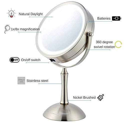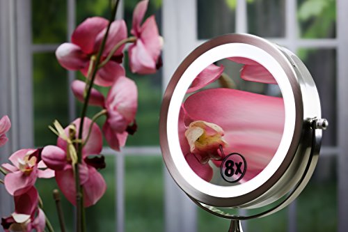 COMPREHENSIVE – This dual-sided 360° swivel design luxury mirror features 1x8x magnification. 1x for a great view of your entire face all at once, and 8x for precision, because every detail counts (7” diameter)