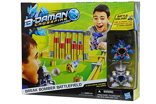 Ready, Aim, Crossfire! B-Daman battles are all about nonstop marble-blasting mayhem. You can be the battler you want to be by choosing the figure that best represents your personality and B-Daman fighting style. The Break Bomber Battlefield comes with everything you need for intense, head-to-head battles. It includes a complete arena with the Break Bomber set in the center, 2 B-Daman figures, 20 B-Da Marbles, and 2 Wide Magazine accessories for rapid-fire blasting.  The Break Bomber Battlefield brings nonstop marble blasting and fun competition together in one ultimate arena. View larger  Use the Power Type Thunder Dracyan to take on the Rapid-fire Type Lightning Dravise to see who can blast 3 red blocks in the other's territory first! To do so takes a mix of Power, Rapid-Fire and Precision skills. View larger  Take your B-Daman battle into the virtual world by scanning your B-Daman figures with the free B-Daman App or entering the codes on the included collector cards at the bdamanbattles website. View larger  Ultimate head-to-head competition. View larger  Thunder Dracyan vs. Lightning Dravise. View larger  Virtual battles. View larger Hasbro is committed to being an ethical and responsible company and is a recognized toy industry leader in the areas of product safety, environmental sustainability, ethical sourcing and philanthropy. Features: - Thunder Dracyan vs. Lightning Dravise