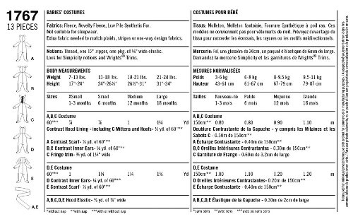 - Title : Simplicity 1767 Size A (1/2-1-2-3-4) Toddler's Animal Costumes and Hats Sewing Pattern, Size A (XS-S-M-L)