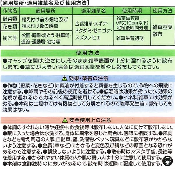 | 有効成分は100%食品成分であるお酢で作った除草剤です。お子様やペットのいる家でもご使用いただけます。成分が土壌に残留しにくく何度でも使用可能です。 |