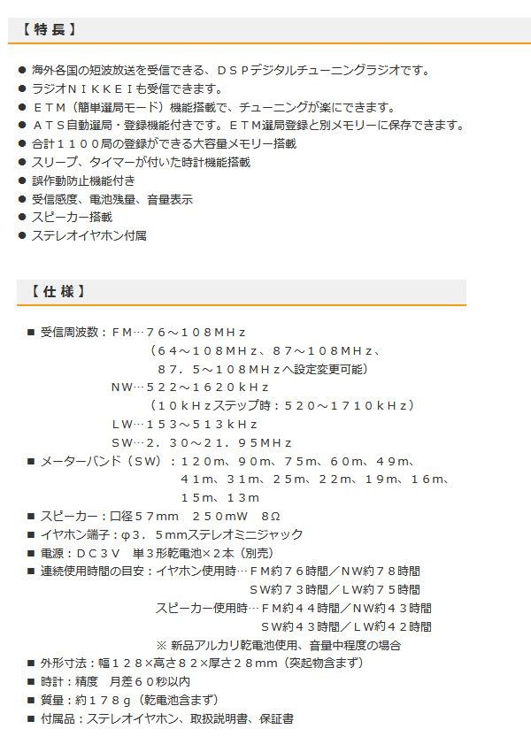 fk094igrjs合計1100局登録できる大容量メモリー搭載海外各国の短波放送が受信できるDSPデジタルチューニングラジオですサイズ個装サイズ:18×19×4cm重量個装重量:275g仕様保証期間:1年間製造国中国各国の短波放送を受信できるDSPデジタルチューニングラジオ合計1100局登録できる大容量メモリー搭載海外各国の短波放送が受信できるDSPデジタルチューニングラジオです