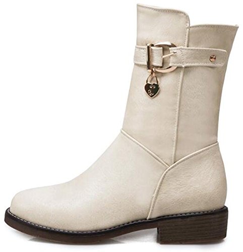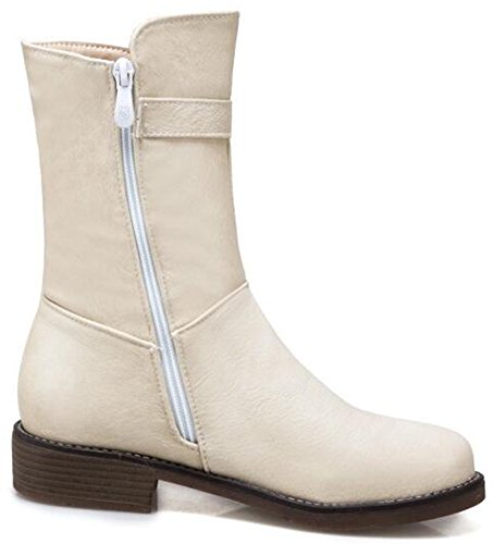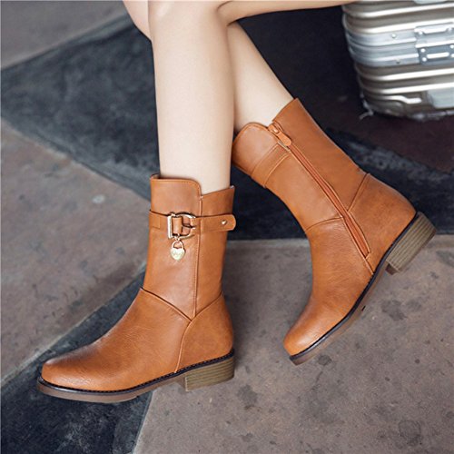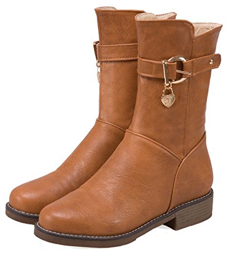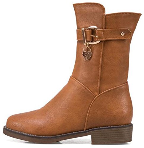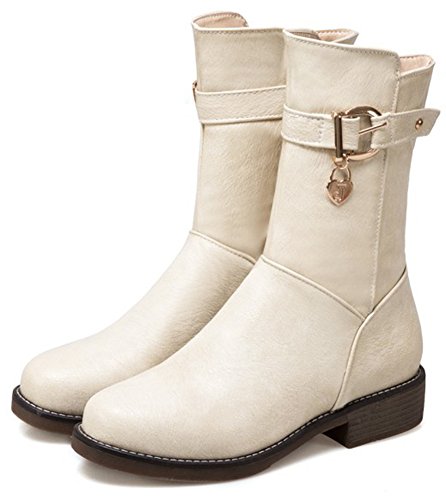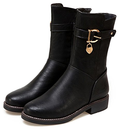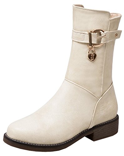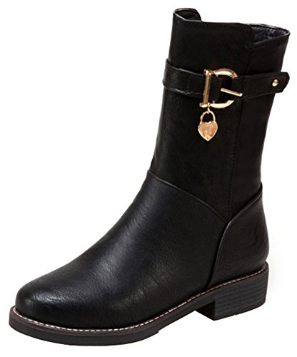 (Mofri)/Women's/Boots/DIRECT FROM USA/Mofri Women's Stylish Buckle Belt Pendant Round Toe Block Low Heel Side Zipper Mid Calf Riding Boots