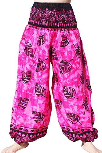RaanPahMuang Smock Waist Light Rayon Print Summer Viscose Elephant Pants, Medium, Falling Leaves Pink