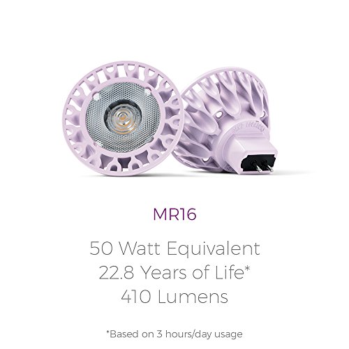 2-Pack SORAA Radiant MR16 GU5.3 lights are the optimal soft white (2700K) color and brightness for comfortable all-day use. Each bulb puts out 410 lumens, or the equivalent to a 50 watt incandescent.
