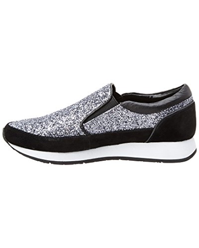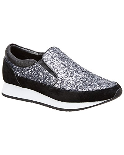 Product DescriptionColor/material: gunmetal suede. Design details: glitter design. 1in platform. Elasticized gores at sides. Lightly padded leather insole. Man-made sole. Imported0