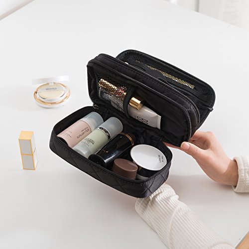- DOUBLE LAYER DESIGN: The unique design of the first layer, greatly increasing the storage capacity, when filled with full items, the surface of the bag is more docile and smooth. The two-layer mesh bag design, easy to storage small items, mask stick, Y - type fork, etc. Transparent spacer design can block the brush off, and prevent the bristles stuck the zipper.