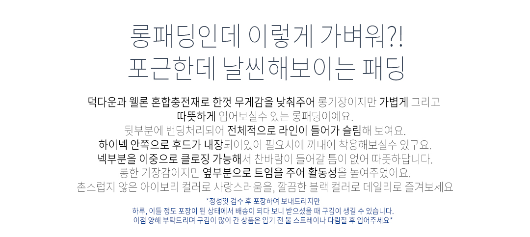 겉감폴리(polyester/)100%안감폴리(polyester/)100%충전재오리솜털(duckdownyhair/)50%+솜(cottonwool/)50%
