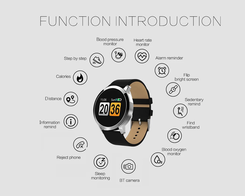 Function:Passometer,Sleep Tracker,Calendar,Heart Rate Tracker,Alarm Clock,Fitness Tracker,Message Reminder,Call Reminder