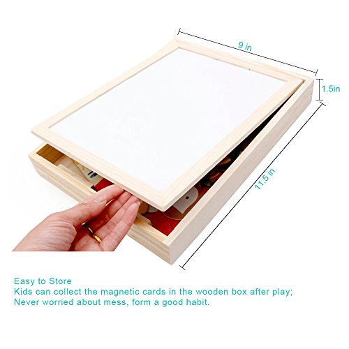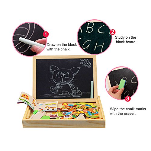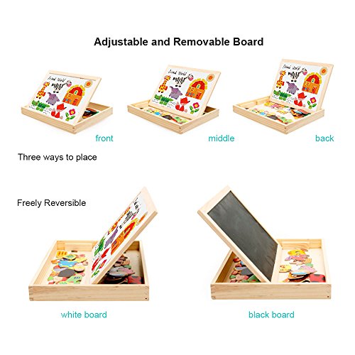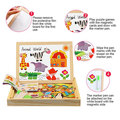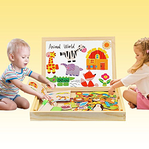 Let your child engage their imagination, have fun, learn and discover concepts and train their motor skills. ---Diwenhouse Wooden Magnetic Jigsaw Puzzle 100 Pieces Help Your Kid's Development This educational toy will encourage your child's recognition for patterns, hand-eye coordination and spatial intelligence, as they try to form animals, plants, figures and pictures either inspired by the examples or by what they have in mind. This magnetic puzzle set will also help the kids improve their aesthetic judgment, learning about the match of all shapes and colors and distinguish which element is more appropriate and beautiful. Multifunctional Wooden Magnetic Board Set 1. On the black chalkboard, children can write or draw with the supplied chalk. You can wipe the chalk marks with an eraser inside the box. 2. On the white magnetic side, children can play puzzle game with magnet and draw with the marker pen. A Great Activity While Traveling Portable and easy to store, it is an great traveling game for your little ones, keeping them busy and quiet for a while, having fun passing time while in the car. Note: Remember to remove the protective film from the white board before using it for the first time. What You Will Get: 1×wooden box 1×reversible double sided board 100×magnetic paper pieces 3×chalks 1×marker pen 1×idea book 1×blackboard eraser Friendly Customer Service We are always here to provide prompt and satisfying customer service if you have any idea about the product. 0 |