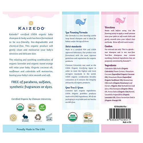 - Feature : 100% MONEY BACK GUARANTEE: If for any reason you are unsatisfied, just email us stating the reason you are unhappy and you will receive a courteous and prompt refund. It's that simple! Proudly made in the USA. / FREE ORGANIC BAMBOO WASH CLOTH: Kaizedo Baby Shampoo comes with a complimentary 100% Organic Bamboo wash cloth with each purchase. / EASY-TO-USE FOAMING PUMP: The easy-to-use foaming pump makes it simple and convenient to bathe infants. / ALL ORGANIC INGREDIENTS: Our premium product contains 95% USDA certified organic ingredients that are gentle for your baby's sensitive skin. The combination of organic essential oils and nondrying organic ingredients will relax and soothe, leaving your baby's skin smooth and soft. Our organic natural ingredients are biodegradable and will not harm the environment or pollute water sources. Never tested on animals. Cruelty free. / USDA CERTIFIED: Kaizedo baby shampoo and body wash has been formulated and tested by a third party in order to meet USDA stringent standards. USDA organic certification benefits consumers as it ensures the integrity and purity of the product. ECO-FRIENDLY AND SAFE: Kaizedo Baby products provide only the best, premium organic skin care formulations for babies.