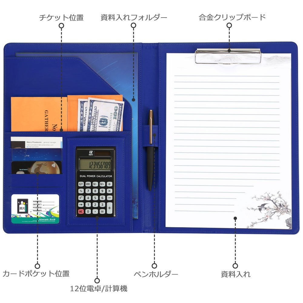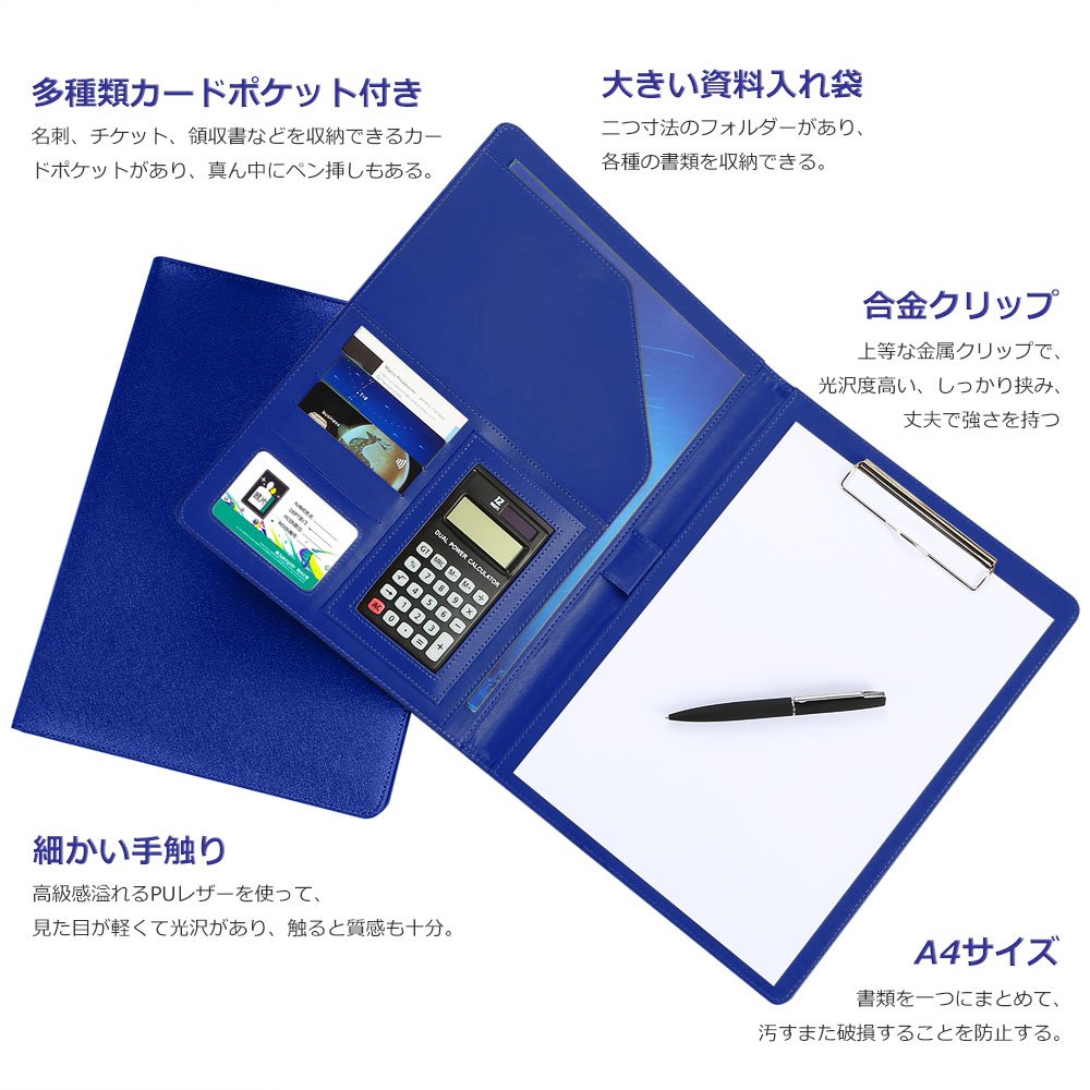カード、名刺、領収証、ボールペンなども収納することができます。 12桁のデジタル電卓が付いていますので、仕事中いつでも計算できます。 高品質なポリウレタン、合革で作られています。サイズは32.3cm×25.1cmです。 A4サイズの設計で折り畳み式ですので、しわ・折り目等つけることなくきれいな状態を保ちます。 会議、インタビュー、講義、ビジネスなど様々なシーンで活躍