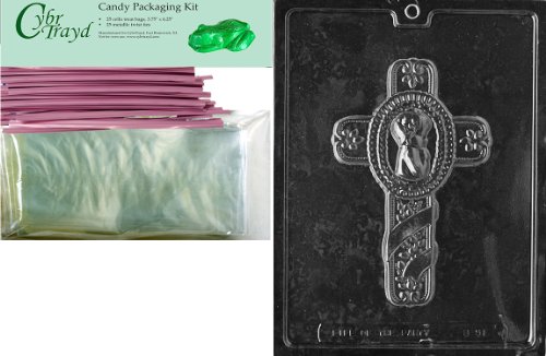 Cybrtrayd "Baby's Baptism Cross" Baby Chocolate Candy Mold with Packaging Bundle, Includes 25 Cello Bags and 25 Pink Twist Ties