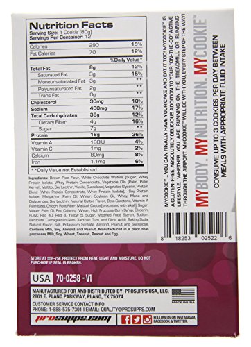 ReleaseDate : 2017-05-30 Studio : Pro Supps Publisher : Pro Supps Binding : Health and Beauty Product Description MYCOOKIE. you can FINALLY have your cake and eat it too! MYCOOKIE is a gluten free, delicious addition to your "on-the-go" active lifestyle. Whether you're lifting weights, running on a treadmill or running through the airport, MYCOOKIE will be with you, every step of the way! MYCOOKIE protein cookies are perfect for a post workout or in between meals protein boost when you're on the run. Build muscle faster by taking one 30 minutes after every workout. Each cookie provides the perfect balance of protein (18g) and only 7g of sugar to boost protein synthesis. That means more protein is being absorbed so you get faster muscle gains. Each cookie is designed for the athlete in mind but they also taste great. They're not chalky like your average protein cookie and come in four delicious flavors; Chocolate Chip, Peanut Butter, Snickerdoodle and White Chip Chocolate. The MYCOOKIE protein cookie is easy to pack in your gym bag so you can take a few with you wherever you go. When you're done training, you've got an instant snack ready to go. They're a perfect fit to your existing diet as well. They clock in at a mere 290 calories so you won't break your diet by having one! 0