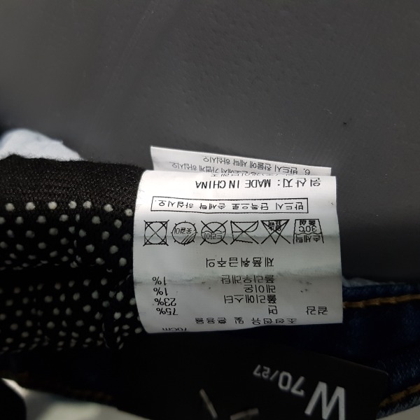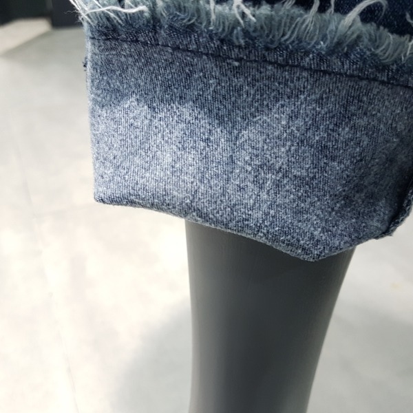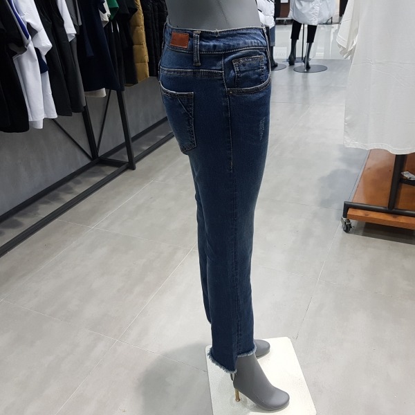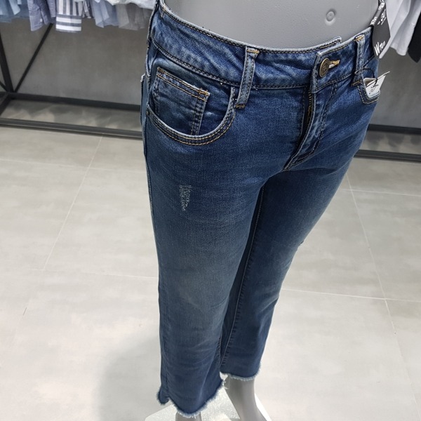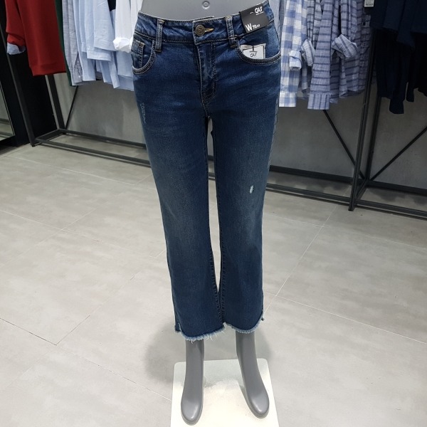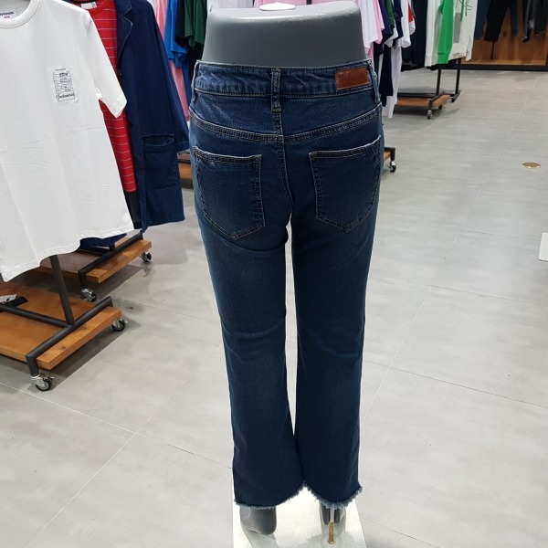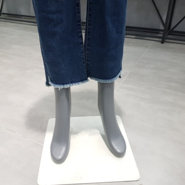 미디엄 인디고 컬러의 기모 크롭 세미 플레어 핏.그린 컬러의 틴을 더해서 차분하고 독특한 데님컬러로 제안하는 제품.밑단은 사선으로 커팅되어 있어 발목 부분이 돋보이는 스타일.