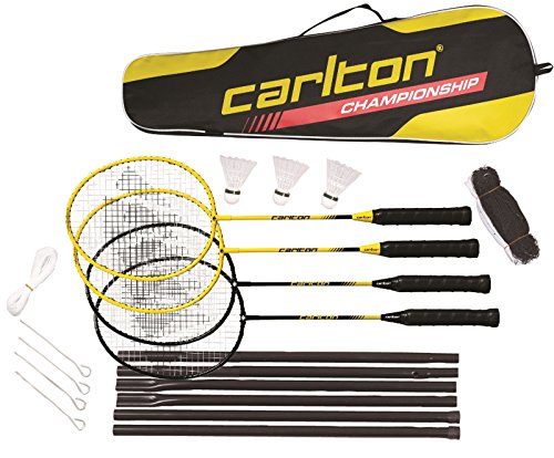 The Carlton Championship badminton set features four racquets, storage bag, three shuttlecocks and a net.
