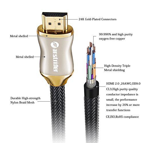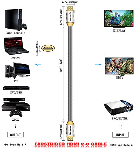 FARSTRIDER HDMI 2.0 Version Super High Quality Cable v1.4a with 3D Technology and Audio return(ARC)/CAT-2 HDMI Cable(Full 1080p/2160p approved),Full Ultra HD 4k support - 2160p (4096 X 2160 pixels),extended colour spaces such as xv Colour and Deep Colour.Supports 720p, 1080i,1080p and 2160p also Supports 4K x 2K Video and more color spare,Supports 54-Bit Deep Color for a Crispy Image.Supports True HD Dolby 7.1 and DTS-HD Master Audio,Support for all television with 1000Hz rates and above.