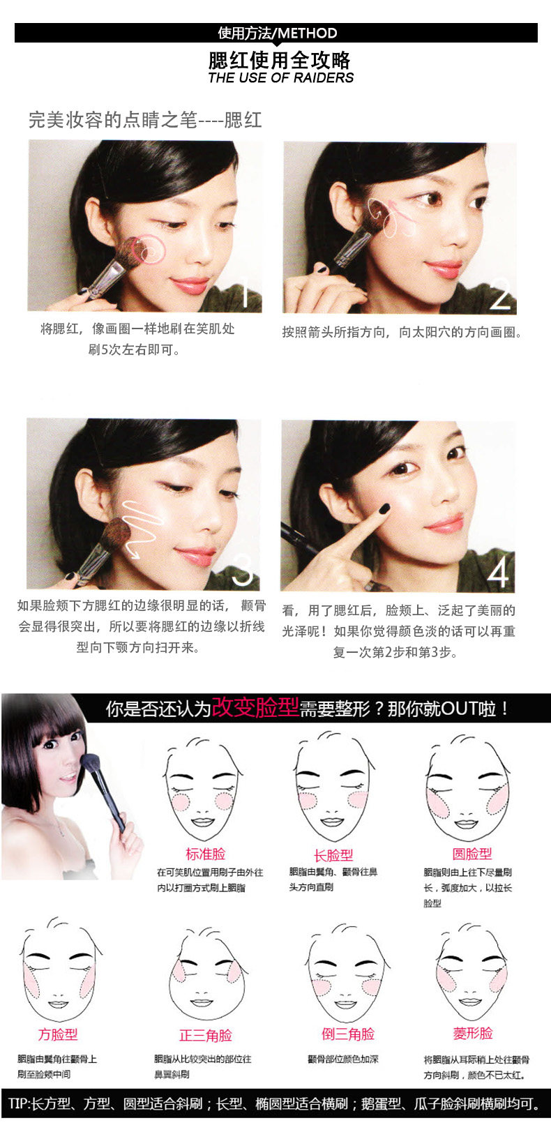 Usually love to makeup, makeup, facial care about you want to create anatural, partly hidden and partly visible pink face MM suitable to useBlusher Brush dipped into the amount of blush, laughing muscle ring, and then to the direction of the temple lightly. Avoid by all means is under the heavy hand oh! After sweeping, blush, can be a thin layer of powder, the powder can make makeup more lasting. A more natural makeup effect