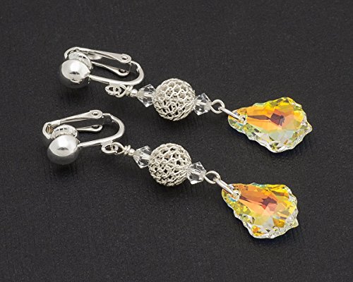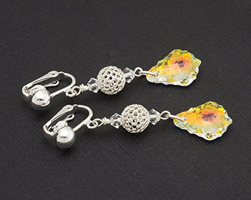 -. Title : Aurora Borealis Swarovski Elements baroque crystal drop bridal silver clip on earrings