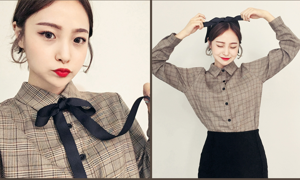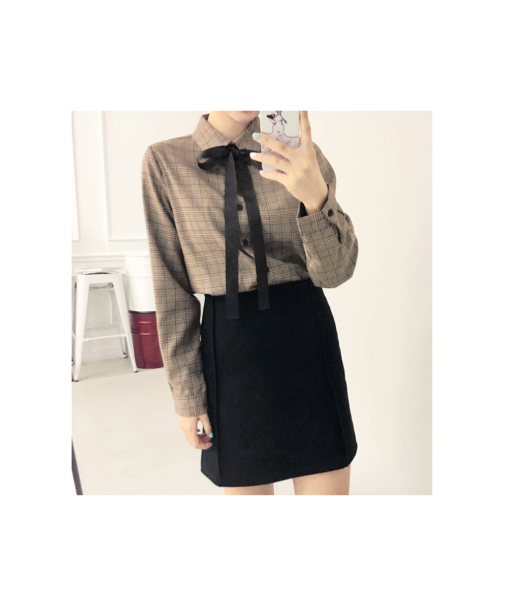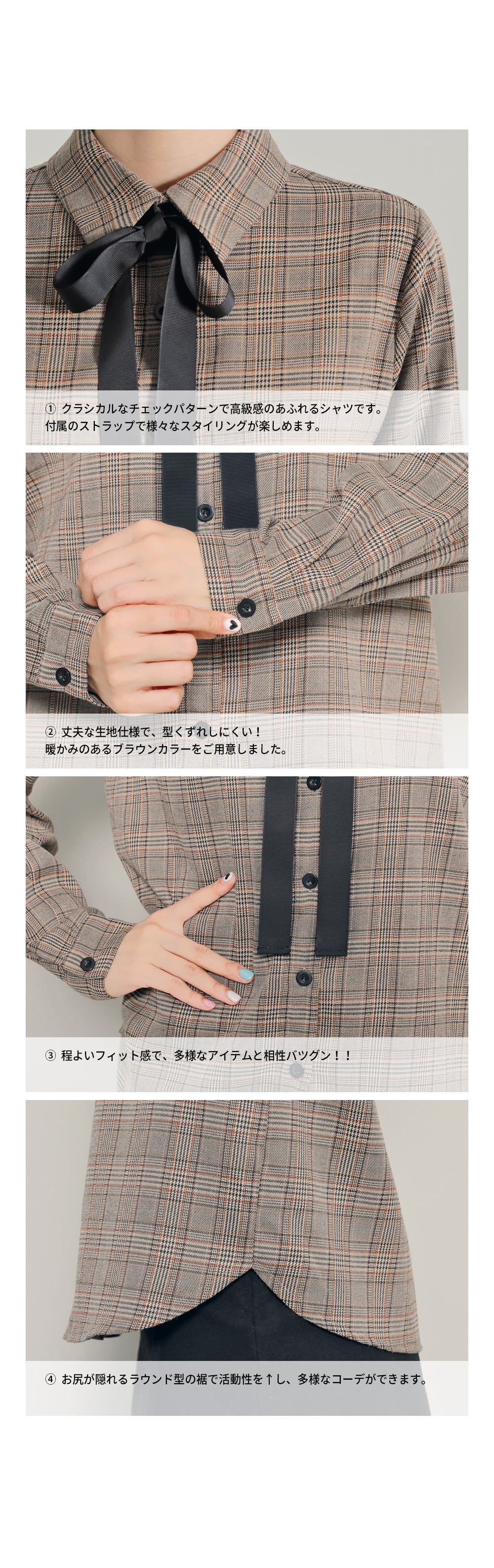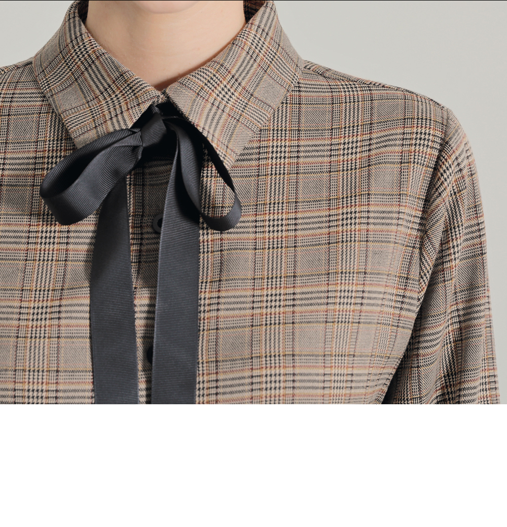 今シーズントレンドのマニッシュなチェック柄が魅力のブラウスです。暖かみのあるブラウンカラーで、首元のリボンを結んでラブリーさをUP!リボンを外して、カジュアルにコーデしてもOK!自分好みのスタイルを楽しめます♬スカートともパンツとも相性の良いデイリーアイテムです。