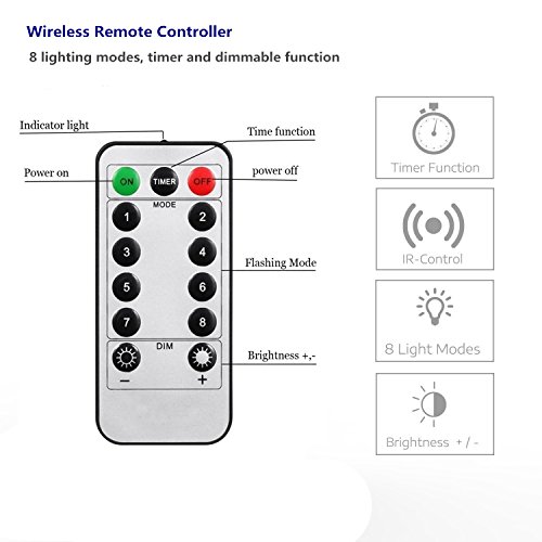 - ✜Remote Controller with 8 Light Modes: The battery operated light have 8 lighting mode with combination, wave, sequential, slo glo, chasing, solve fade, twinkle and steady on, which can controlled by wireless remote or the switch on the battery compartment.