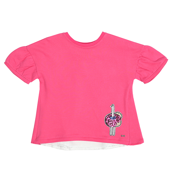 색상-핑크사이즈-110,120,130,145,155,165상세설명-등판에 레이스 배색처리한아이템으로 귀엽고 사랑스러운 아이템이다 타조모양의 원포인트로 더욱더 여아느낌을 주는아이템이다.