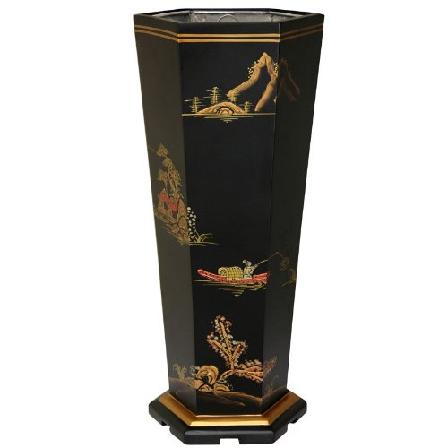 Studio : Oriental Unlimited Inc Publisher : Oriental Unlimited Inc Product Description Hand-crafted and painted to create a unique piece for your home, the Oriental Furniture Landscape Umbrella Stand features rich detail on its lacquered wood frame. A metal liner offers reliable protection for long-lasting, practical appeal, and the sleek lacquer finishes its exterior in elegant style. Dimensions: 9.25W x 8D x 21H in.. Constructed of elm wood. Hand painted landscape scene. 12 coat lacquer finish. 0