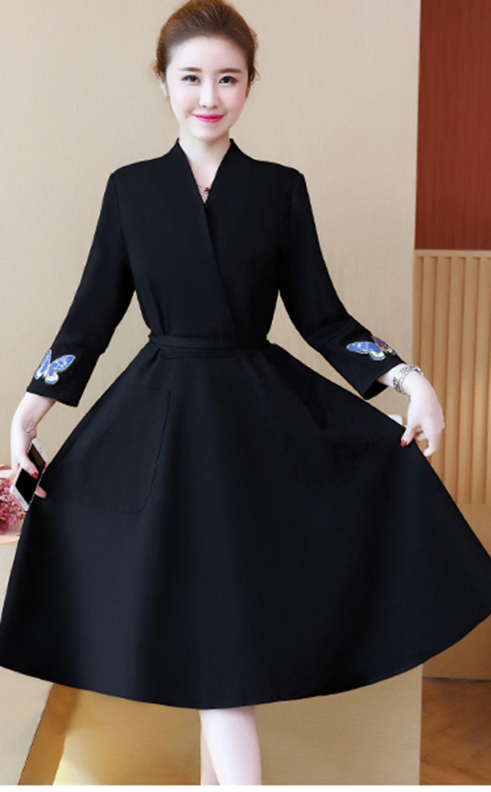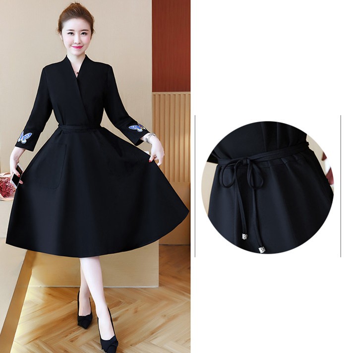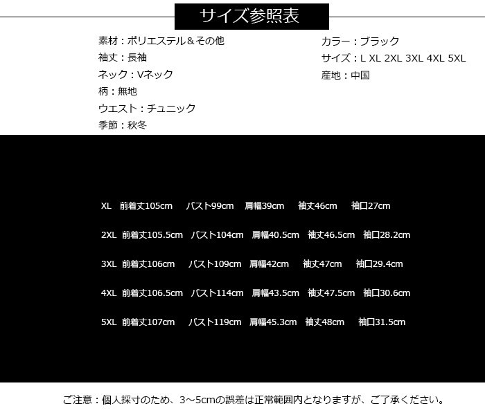 ワンピース レディース 結婚式 チュニックワンピース 大きいサイズ 膝丈 OL通勤 着痩せ 2018秋冬新作 ワンピース 結婚式 チュニックワンピース レディース商品詳細素材:ポリエステル&その他袖丈:長袖ネック:Vネック柄:無地ウエスト:チュニック季節:秋冬カラー:ブラックサイズ:L XL 2XL 3XL 4XL 5XL産地:中国サイズ参照表XL 前着丈105cm バスト99cm 肩幅39cm 袖丈46cm 袖口27cm2XL 前着丈105.5cm バスト104cm 肩幅40.5cm 袖丈46.5cm 袖口28.2cm3XL 前着丈106cm バスト109cm 肩幅42cm 袖丈47cm 袖口29.4cm 4XL 前着丈106.5cm バスト114cm 肩幅43.5cm 袖丈47.5cm 袖口30.6cm5XL 前着丈107cm バスト119cm 肩幅45.3cm 袖丈48cm 袖口31.5cmご注意:個人採寸のため、3~5cmの誤差は正常範囲内となりますが、ご了承ください。ワンピース レディース 結婚式 チュニックワンピース 大きいサイズ 膝丈 OL通勤 着痩せ 2018秋冬新作 ワンピース 結婚式 チュニックワンピース レディース