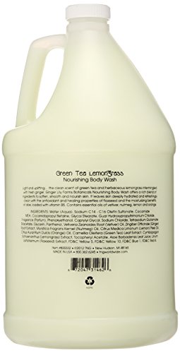 Ginger lily farms botanicals green tea and lemongrass body wash is formulated with vitamin E, lavender and aloe. Paraben and sulfate-free. Recommended for hospitality and locker rooms. Gallon. Gallon size. Paraben and sulfate free. Great for gyms or spas.Feature