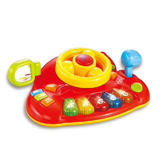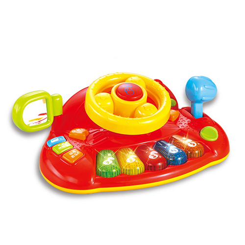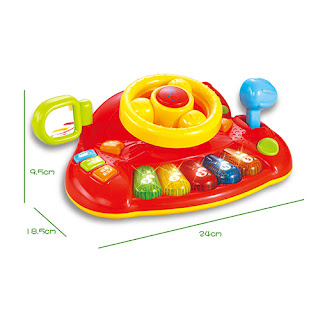 Your baby can drive too with this playful dashboard and steering wheel. Attach it to the car seat or stroller bar and let baby steers, turns the iginition key or plays with the buttons. The contrast patterned steering wheel and driving dashboard is equiped with indicator lights and gearshift. Comes with a key to control flash lights. Made of environmentally friendly ABS plastic. It is a perfect educational toy.