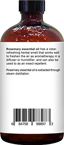 -. Feature : Premium Quality Rosemary Oil, 100% natural, steam distilled and pure rosemary essential oil; non-toxic, no additives, unfiltered and undiluted with no fillers; therapeutic grade, packaged in USA. / Powerful and Purifying: Pure rosemary oil is widely accepted and used by most natural healthcare practitioners and aroma therapists. It's known to elevate the spirits and neutralize stress and anxiety. / SAFETY WARNING: For external use only. Other than aromatherapy, dilute with a carrier oil. For topical use, rub a very small amount on the inside of your elbow area to test for any allergic reaction before use. Keep out of the reach of pets. Essential oils can be potentially toxic to pets at certain concentrations. Cats can be especially sensitive to essential oils. Avoid contact with eyes, keep out of the reach of children. If pregnant, consult with your health care provider before use. / Rosemary essential oil can be helpful in reducing muscle aches and pains. Mix 2 drops of rosemary oil, 2 drops of peppermint oil and 1 tsp of fractionated coconut oil to rub on sore muscles. Hair and Skin Care: Rosemary oil is known for being a natural all-around remedy. / Large 4 ounce and premium quality glass dropper for ease-of-use. Purchase with complete peace of mind, we are confident we have developed the absolute best essential oils in the market.