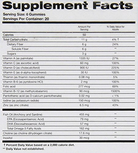 -. Binding : Health and Beauty -. Brand : SmartyPants Gummy Vitamins -. EAN : 0851356004248 -. Feature : 10 ESSENTIAL NUTRIENTS AND WILD-CAUGHT OMEGA 3 FISH OIL for brain health / 6 g PREBIOTIC FIBER for digestive health / 3 g SUGAR PER SERVING from inulin syrup and GRAS-certified lo han fruit / VITAMIN D3 for bone health + HIGH POTENCY B12 for mental focus and energy balance / GALAXY'S BEST TASTING GUMMY VITAMIN! No fishy or vitamin-y taste because we spread our nutrients out over 6 gummies per serving. NON-GMO. ALLERGEN-FREE. NO SYNTHETIC COLORS OR FLAVORS. -. IsAdultProduct : 0 -. Label : SmartyPants Gummy Vitamins -. Manufacturer : SmartyPants Gummy Vitamins -. MPN : na -. NumberOfItems : 1 -. PackageQuantity : 1 -. PartNumber : na -. ProductGroup : Health and Beauty -. ProductTypeName : HEALTH_PERSONAL_CARE -. PublicationDate : 2014-01-22 -. Publisher : SmartyPants Gummy Vitamins -. ReleaseDate : 2015-07-16 -. Size : 15 Pack(s) -. Studio : SmartyPants Gummy Vitamins -. Title : SmartyPants Adult Complete + Fiber On-The-Go Gummy Vitamins: Multivitamin AND Omega 3 DHA / EPA Fish Oil, D3, B12 (Methylcobalamin), Inulin Fiber, 15 count -. UPC : 851356004248