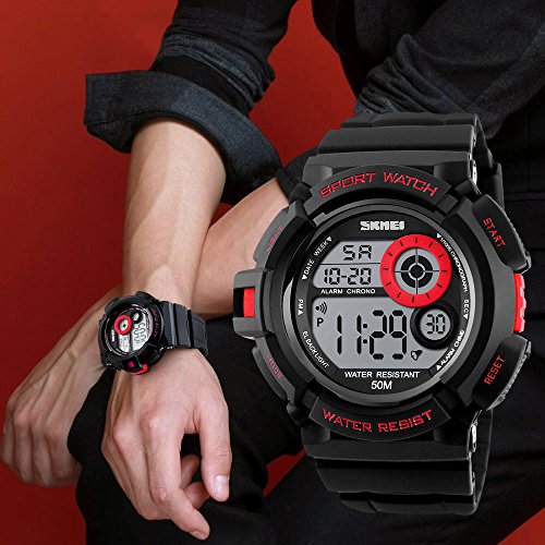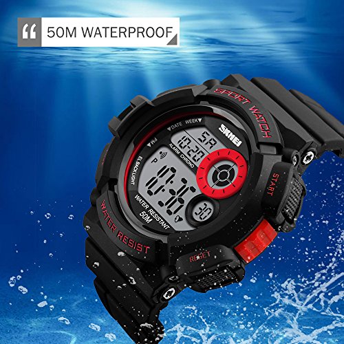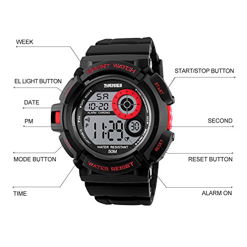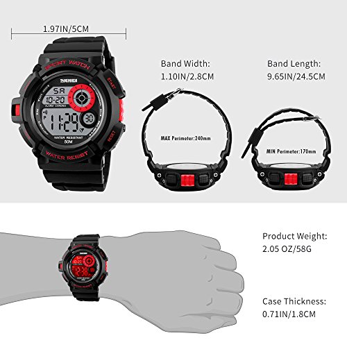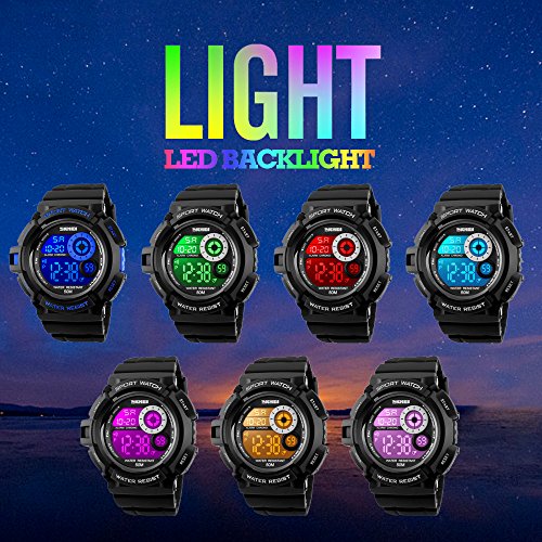 Multi-Function Watch: LED display large numbers for time and calendar; alarm; 12/24H format selectable; 1/100 seconds chronograph; seven colors back light, Hold "LIGHT" button to change, makes reading easily and fun.