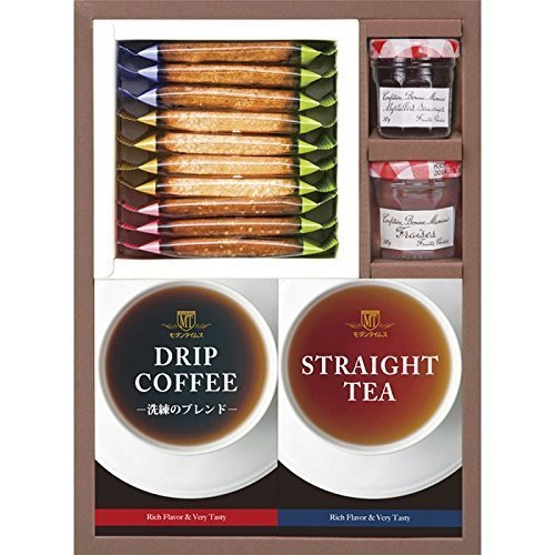 原材料:ドリップコーヒー(8g×3袋)・紅茶ティーバッグストレート(2g×10袋)・メリーズクッキー(プレーン4枚・セサミ3枚・コーヒー3枚)・いちごジャム30g・ブルーベリージャム30g