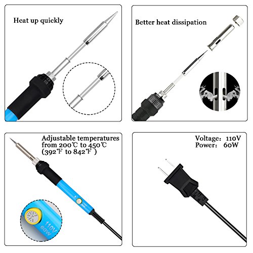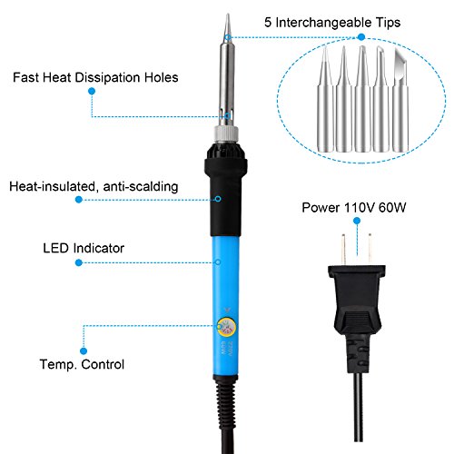 ANBES Soldering Iron Kit , 60W 110V Adjustable Temperature Welding Soldering Iron, 5pcs Soldering Tips, Desoldering Pump, Tin Wire Tube, Stand, Tweezers, Wire Stripper Cutter, 2pcs Electronic Wire