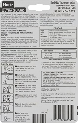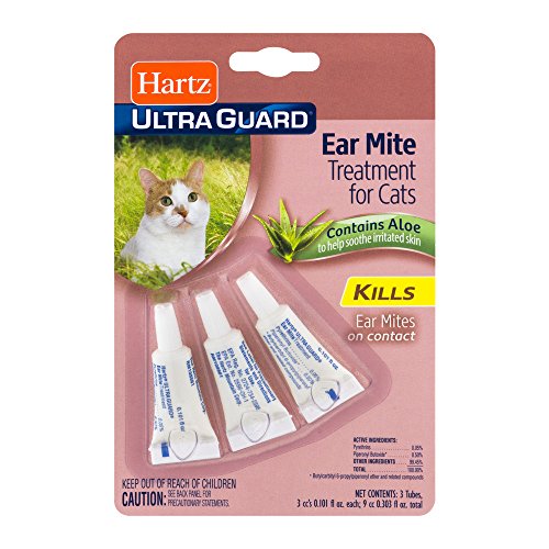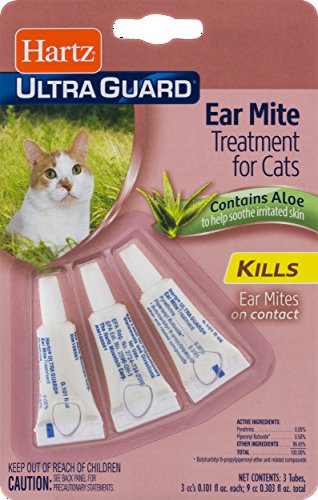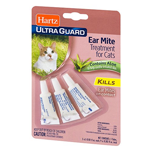 -. Binding : Misc. -. Brand : HARTZ -. EAN : 0607963708808 -. Feature : Kills ear mites on contact. / Contains aloe to help soothe irritated skin. / 3 tubes, 3 cc's 0.101 fl oz each / Relief for cats suffering from ear mites. / Trademarks of The Hartz Mountain Corporation. -. Label : Hartz -. LegalDisclaimer : Actual product packaging and materials may contain more and different information than what is shown on our website. We recommend that you do not rely solely on the information presented and that you always read labels, warnings, and directions before using or consuming a product. -. Manufacturer : Hartz -. MPN : 98199 -. PackageQuantity : 9 -. PartNumber : 98199 -. ProductGroup : Pet Products -. ProductTypeName : PET_SUPPLIES -. Publisher : Hartz -. Studio : Hartz -. Title : PACK OF 9 - Hartz Ultra Guard Ear Mite Treatment for Cats Contains Aloe, 0.101 FL OZ -. UPC : 607963708808