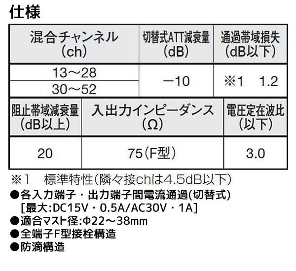 | 付属品 | 5C用F型接栓3セット、防水キャップ3個、取付ねじ2本、マスト取付金具1セット、取扱説明書 |