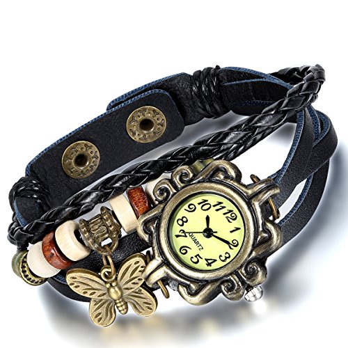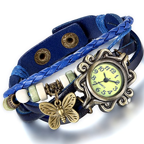 -. Feature : 100% Brand new + One velvet gift bag / Quartz movement + Vintage case pendant / Retro beads and butterfly leather weaved bracelet / Five colors you can choose to match any occasions / No waterproof function
