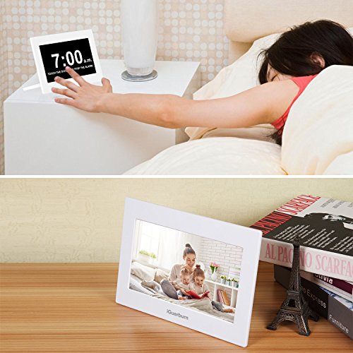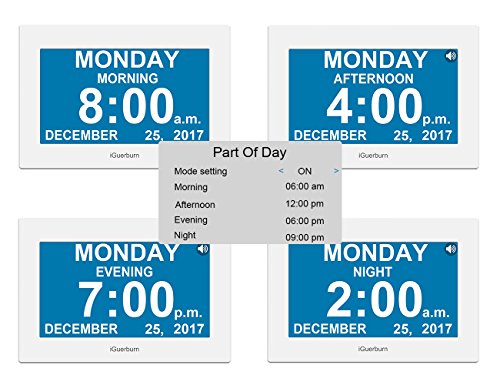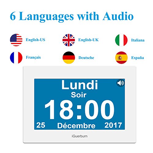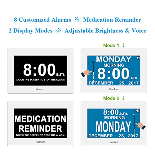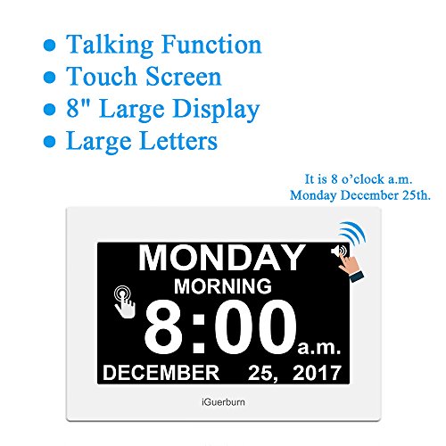 Make Keeping Track of Days, Times, and Schedules Easier with a Talking Alarm Clock from iGuerburn. Staying ahead of your schedule can be challenging for even the most organized people; and it can be downright terrible if you suffer from memory loss, dementia, blindness, or Alzheimer's. That's why we created the multipurpose iGuerburn Digital Talking Clock that helps give you an audible reminder up to 8 times a day to accomplish your goals, take your medicine, and stay on top of all the other things that need to be done. Product Details: Talking Digital Clock 2 Display Modes Vibrant Touchscreen Easy to Read Numbers and Letters (All capital letter, No abbreviations) Customized Display Morning, Afternoon, Evening, Night, or All Day Large 8" Display Time Setting Memory (Power Failure Safety) 12-Hour or 24-Hour Settings Audio and Text in 6 Languages Brightness and Voice Volume Adjustable Patent Protected Unique Design Talking Function The audible function is easy to hear and understandable in six total languages, making it good for people of all cultures. The volume can also be changed to suit your comfort level. Day Display Modes Time can be customized to suit the users needs in very particular fashion. In fact, you can set any time as demanded and create your own morning, afternoon, evening, or night schedules. Truly Supports Daily Lives Medication Reminder The versatile alarm system lets you set multiple alarms throughout the day, so you can prepare for morning, evening, appointments, kids getting out of school, and more! Brightness Adjustable Quickly and easily change the screen brightness and overall voice volume to make it easier to see and to hear if you struggle from poor vision or hard of hearing. Digital Photo Frame 0 |